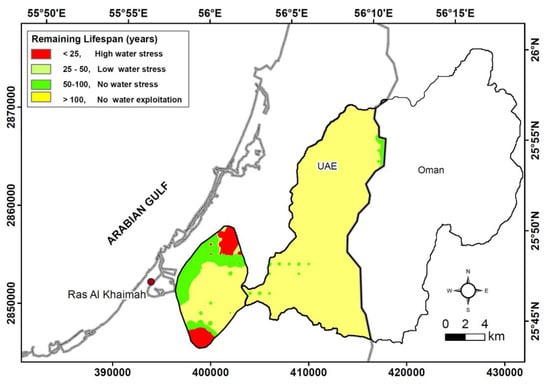 The results of the WBM were used with the blue water scarcity index (WSI) equation (Equation (11)) to construct the water scarcity map shown in Figure 12. The available water resources were set to only equal the recharge of the Quaternary aquifer from all sources (direct rainwater percolation, horizontal flux from Oman mountains, and return flow from all sources, whether irrigation or network leakage). In the locations of agricultural activities, groundwater abstraction ranges from 4 to 7 folds of groundwater recharge even in a wet year such as 2019/2020 (purple and red colors in Figure 12). In these areas, groundwater replenishment ranges from less than 1% to 20% (brown and purple areas in Figure 13). Under the business-as-usual scenario, the remaining lifespan of the depleting groundwater resources is less than 25 years in the farm’s area (Figure 14). In this water-stressed area, irrigation must rely on fossil groundwater of salinity up to 5,000 mg/l. The blue water scarcity index map with the consideration of non-conventional water resources [32] is shown in Figure 15. Additionally, the alluvial fan area (except the urban area) is suffering from one degree or another of water stress. The comparison of Figure 12 and Figure 15 for the blue water scarcity index (WSI) with and without the consideration of non-conventional water resources indicates that the settlement and urban areas have high water security or very low water stress.