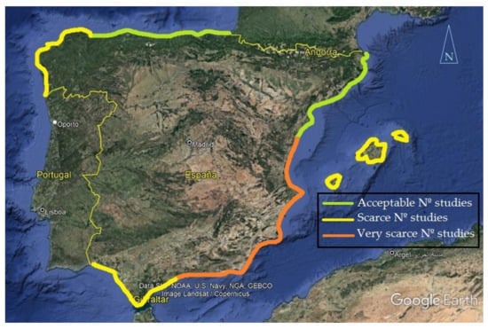 Although, as has been seen above, there are a large number of climate studies along the Spanish coast, the Levante area is one of the least studied areas. The Levantine basin is an enclosed basin affected by regional wave and wind patterns that are different from the global patterns. Despite this condition, most of the studies of the Levantine basin focus on very specific points, such as the Ebro Delta or the Catalan Maresme, leaving many areas without climatic studies [,,]. Figure 1 presents a colour scale to illustrate the relative number of climate studies that have been carried out on each Spanish coast.