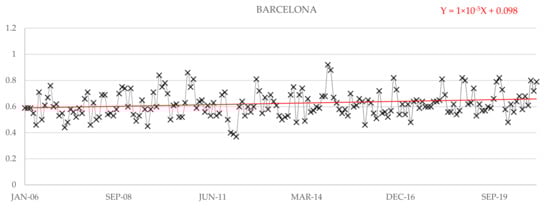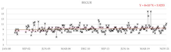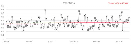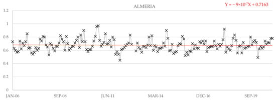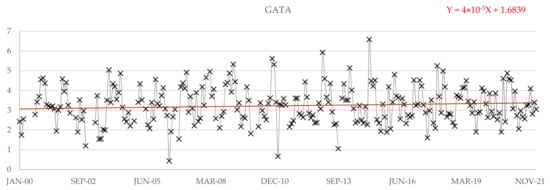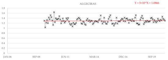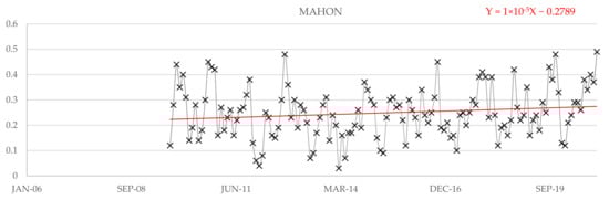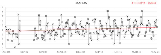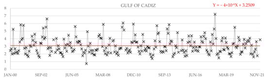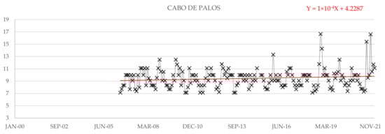 Each graph also shows the trend line following the maxima of Hs and its analytical expression (in the colour red). This was carried out by means of a linear adjustment because it was considered to give the most visual and tangible image of the trend followed by the extremes. This will facilitate the analysis of the results and the reaching of the conclusions presented in Section 4 and Section 5.
