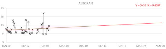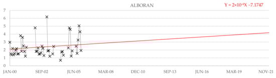 The Alboran graph (Figure 4) is one of the graphs with the steepest trend line in Hs extremes (0.0003 slope). This is probably because the records of the Alboran Sea buoy are from 1997 to 2006. From 2006 onwards there are no more records. If there were records from 2006 to 2022, the increasing trend line would probably be much smoother. Furthermore, the Alboran Sea is an area affected by local and regional phenomena due to its position. It is an enclosed sea where the wave and wind patterns are very particular, so part of this increasing trend may also be due to these local phenomena and not just to the data series.