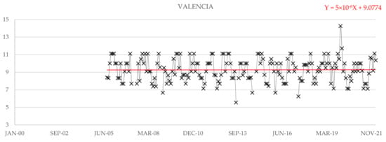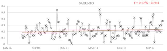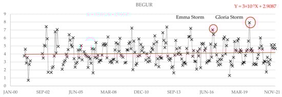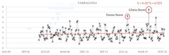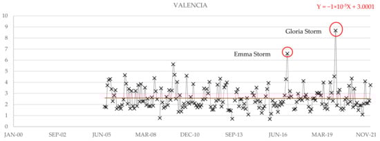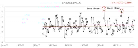 From Cabo de Gata to Begur (Figure 5, Figure 6, Figure 7, Figure 9, Figure 10), the increasing trend of Hs is similar (around 10−4–10−5), excepting the Valencia buoy, which has a slightly decreasing trend. This area may be affected by the same meteorological regional patterns and fluid dynamics. The increasing trend is not as pronounced as in Alboran or Mahon. However, it has to be said that although the trend is less upward, this does not mean that this area is less threatened by extreme events. Although the general trend is less abrupt, this area is prone to very specific but very intense events, as can be seen in the graphs for the 2018 and 2020 storm (Emma and Gloria storm), which far exceeds the rest of the extreme storms. In fact, these “very extreme” events are the most damaging and threatening, and this part of the coast is especially vulnerable to extreme storms. This is also the main reason why the data of these graphs seem to be very scattered, because in this area hydroclimatic extremes are very occasional and intense.