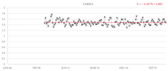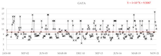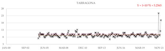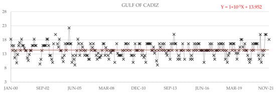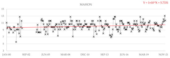The evolution of monthly Tp extremes is presented in Figure 11, Figure 12, Figure 13, Figure 14, Figure 15, Figure 16, Figure 17 and Figure 18. As was done with Hs, the trend line is presented in the graphs and the adjustment performed is linear due to the same reason (colour red). The Y-axis is the Tp in s, and the X-axis the time. The X-axis of the graphs has also been unified and all X-axes of Figure 11, Figure 12, Figure 13, Figure 14, Figure 15, Figure 16, Figure 17 and Figure 18 range from January 2000 to March 2022.