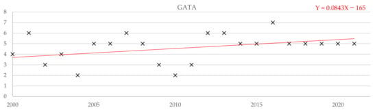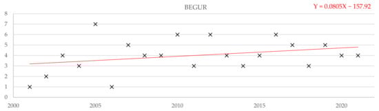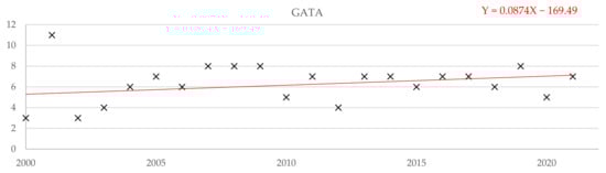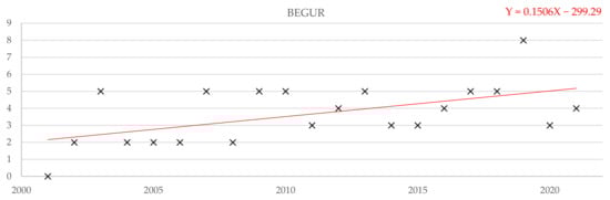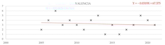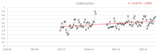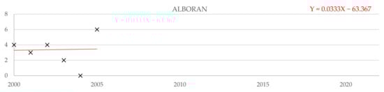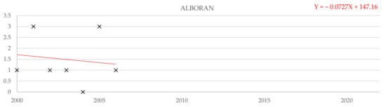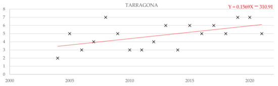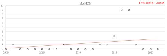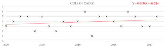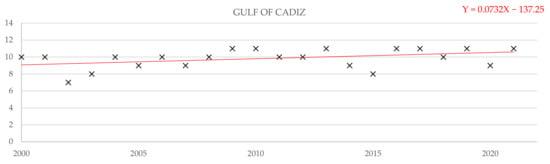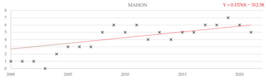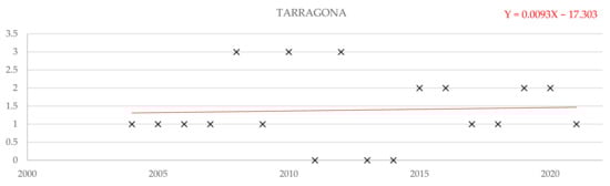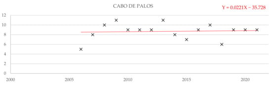 Figure 27, Figure 28, Figure 29, Figure 30, Figure 31 and Figure 32 present the times that Tp has exceeded the expected Tp in 100 years. As with Hs, the Y-axis presents the number of exceedances and the X-axis is time, and all X-axes are unified. In addition, all the graphs present a linear adjustment to facilitate the analysis of the trend of the hydroclimatic extremes (colour red). Valencia results are not presented because in the case of this buoy, the Tp in 100 years was only exceeded twice, once in 2019 and once in 2021.