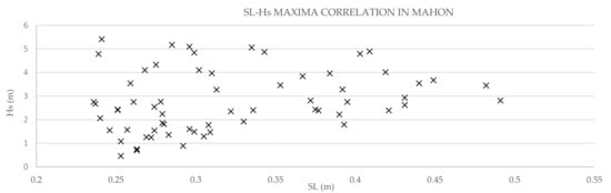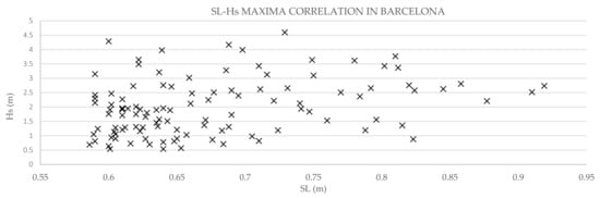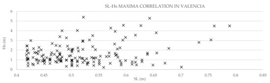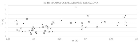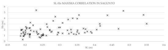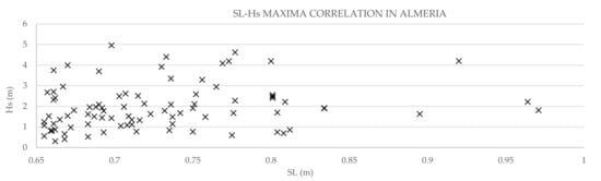 Finally, a statistical study was carried out to analyse the correlation of the hydroclimatic extremes. In this part of the study, the methodology was different. First, the monthly extremes of SL and the day and hour when the event happened were collected. Then, a search for the wave occurring at that hour was carried out and the values were plotted. Therefore, the main variable in the correlation analysis conducted was the SL, and the secondary value was the wave height.