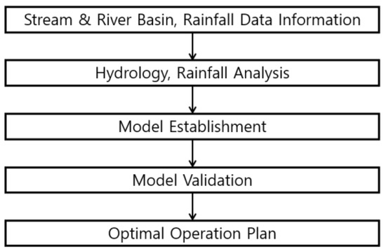 The model provided in the river master plan is an unequal flow model, and the state of the flow does not change over time. When establishing the plan in this research, the water level change over time must be considered by linking the Ara and Gulpo Streams. Thus, a four-part model was obtained from each river master plan to construct a water level change review over time. Figure 2 presents the overall flow of this study.