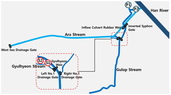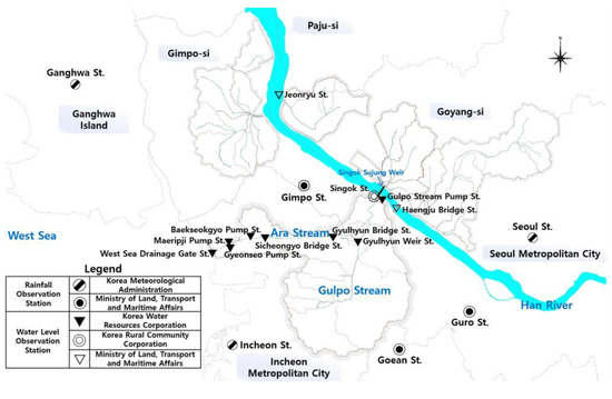 The Gulpo Stream is directly affected by the water level of the main stream of the Han River because it connects to the left bank downstream of the Han River at a distance of 2.3 km downstream of the Haengju Bridge [1]. Most of the rivers flow in low-lying areas with extremely gentle slopes; therefore, when the water level in the main stream of the Han River rises, the floodgates are closed, and water drainage is only dependent on forced drainage pumps, thereby extending the flooding period [3].
