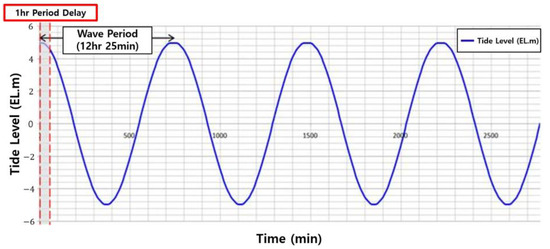 The wave velocity is important factor in flow model. To consider wave velocity to the unsteady flow model, the mean high water level of spring tide was applied. This is because the mean high water level of spring tide was used for design condition and operation rule for West Sea Drainage Gate. In this study, to ensure consistency with previous studies, the mean high water level of spring tide was selected as the estuary tide level. In addition, to estimate the tidal curves over time for calculating the unsteady flow, the average tidal change in a 12 h and 25 min period was applied to the cosine curve, i.e., the time interval to the next high rise from the west and south coast of Korea. The unsteady flow simulation was performed by delaying the estimated tidal curves by 1 h (Figure 4).