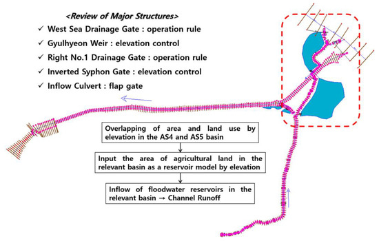The HEC-RAS model data established by the Gulpo Stream Master Plan [1] and Ara Stream Master Plan [2] were acquired and used to further reflect the specifications and operation plans of major structures such as sluice gates, weirs, and pump stations, which are not reflected in the existing river master plan.