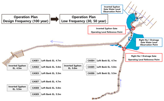 The overall review direction reflected the drainage system of the Gyulhyun Stream during flooding, and the review was conducted while focusing on the Right No. 1 drainage gate and inverted syphon gate, i.e., locations where an operating system was not established. When reviewing the operation plan, nine cases were selected and reviewed based on the above set of basic directions (Figure 8).