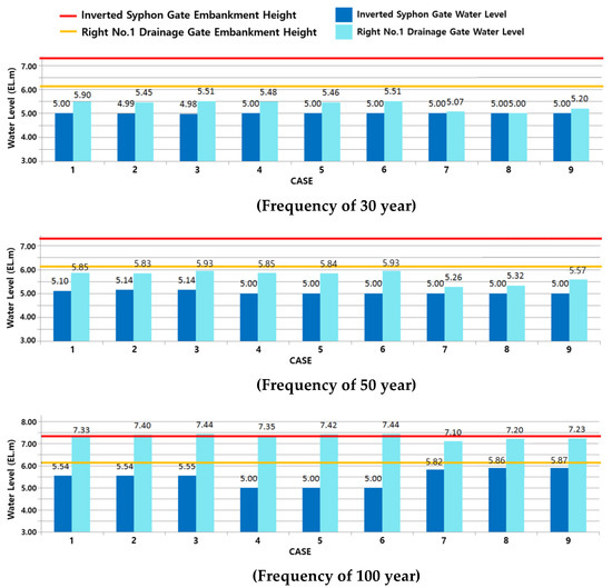 After reviewing the level at each condition, the level considered to be the most stable target level in the two gates (Right No. 1 drainage gate and inverted syphon gate) was adopted as the final operation plan. Details regarding the target level are summarized as follows. Figure 9 and Table 6 shows frequencies of 30-, 50-, and 100-year results.