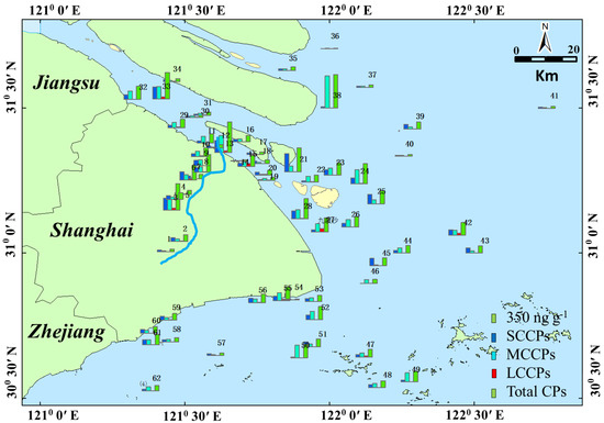 Figure 3. The map shows the spatial distribution trend of concentrations of CPs (ng g−1) in the sampling points in which the blue bar is SCCPs, the light blue bar is MCCPs, the red bar is LCCPs, and the green bar is total CPs.