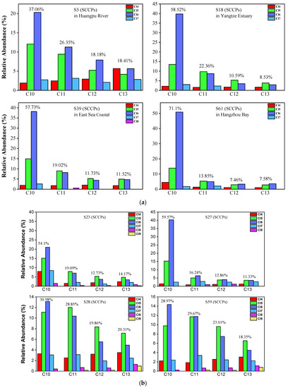 Figure 4. (a) Representative congener group abundance profiles of SCCPs in surficial sediments collected from the Huangpu River, Yangtze Estuary, East Sea Coastal, and Hangzhou Bay. (b) Representative congener group abundance profiles of SCCPs in surficial sediments from the dredging sediment discarding area.