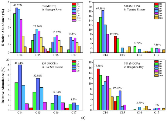 The measured concentrations of MCCPs in all sediments ranged from 22.03 to 1730.78 ng g−1. The MCCP concentrations were generally higher than those of the SCCPs but were in the same range as the concentrations of Yangtze Estuary sediments collected in 2017 [37]. Similar results were also found in suburban soils in Shanghai, in Pearl River sediments, in nine lake sediment cores in China, and in sediments from lake Thun in Switzerland [1,4,13,38]. Although the production of SCCPs has stopped worldwide, M/LCCPs are still used as alternatives. Thus, the concentrations of MCCPs and the ratio of MCCPs/SCCPs were higher due to higher MCCP production than SCCPs. The distribution of MCCPs is similar to that of SCCPs, where the Huangpu River (52.93 to 1191.54 ng g−1, mean of 392.81 ng g−1) and the sediment discarding area (170.11 to 768.12 ng g−1, mean of 417.60 ng g−1) exhibited the highest concentrations. Except for the Huangpu River and the sediment discarding area samples, the mean values of MCCPs detected in the Yangtze Estuary, Hangzhou Bay, and East Sea Coastal samples were 315.10 ng g−1, 307.23 ng g−1, and 241.10 ng g−1, respectively.