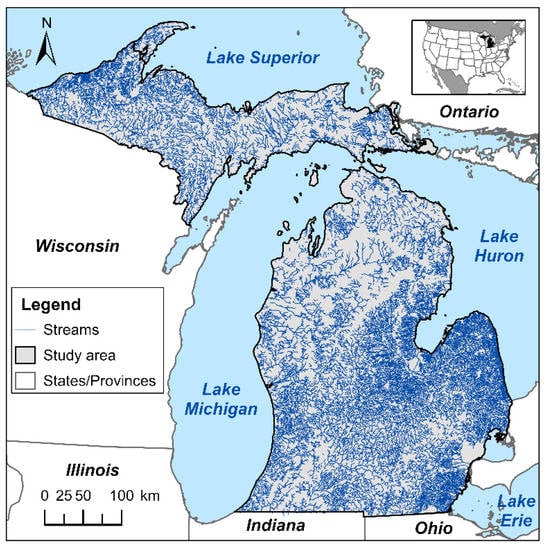 - Brenden, T.O.; Clark, R.D.; Cooper, A.R.; Seelbach, P.W.; Wang, L.; Aichele, S.S.; Bissell, E.G.; Stewart, J.S. A GIS framework for collecting, managing, and analyzing multiscale landscape variables across large regions for river conservation and management. In Landscape influences on stream habitats and biological assemblages; Hughes, R.M., Wang, L., Seelbach, P.W., Eds.; American Fisheries Society: Bethesda, Maryland, 2006; Symposium 48; pp. 49–74. [Google Scholar]