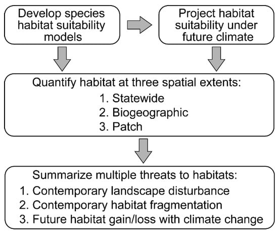 Freshwater biodiversity loss is occurring at alarming rates, with species extinctions and population declines being triggered by an increasing scope and severity of contemporary anthropogenic stressors to aquatic environments and their surrounding landscapes. Habitat degradation resulting from anthropogenic stressors has been identified as a major source of global freshwater biodiversity loss [1], greatly affecting both fishes [2,3] and mussels [4,5,6]. In North America, habitat degradation and range restrictions were identified as primary causes of imperiled fish declines [7] with freshwater mussels being considered the most highly imperiled freshwater taxa [8,9,10]. Similar human stressor-induced declines in fishes and mussels have been observed in many other parts of the globe, such as Europe [11], Latin America [12], and Asia [13]. Beyond the contemporary habitat degradation resulting in these declines, freshwater environments are particularly susceptible to future climate change due to the influence of climatic drivers on both the hydrologic and thermal characteristics of water within these systems [14,15]. Climate change is expected to alter the quality, quantity, and distribution of suitable habitats for many freshwater organisms and further exacerbate the effects of anthropogenic stressors [14,15,16]. These factors put imperiled freshwater species at enormous risk, necessitating conservation assessments that account for both contemporary and future stressor sources.
