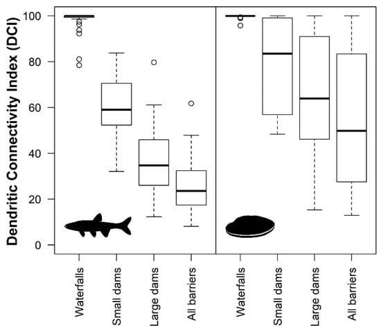 Species-level habitat fragmentation levels and overall taxa-level fragmentation patterns differed by spatial extent (Figure S3). For mussels, percentage of highly suitable habitat with low to moderate fragmentation was typically greatest at the patch extent, with levels of severe fragmentation increasing among the biogeographic and statewide extents. Most fish species had the greatest percentage of low to moderately fragmented habitat at either statewide or patch extent with the biogeographic extent generally having the highest levels of severe fragmentation. Highly suitable habitats for mussels were generally less fragmented than fish habitats among spatial extents, with four mussel species, deertoe (Truncilla truncata), fawnsfoot (Truncilla donaciformis), pink papershell (Potamilus ohiensis), and threehorn wartyback (Obliquaria reflexa) having no connectivity loss due to fragmentation by barriers regardless of spatial extent considered. Stream fishes had high levels of fragmentation overall, including species that exhibit potamodromous migratory patterns [57], such as black redhorse (Moxostoma duquesnei), river redhorse (Moxostoma carinatum), and lake chubsucker (Erimyzon sucetta). At the biogeographic extent, Dendritic Connectivity Index (DCI) values averaged 26.4 (range 8.1–61.8) for stream fishes and 56.6 for mussels (range 12.9–100.0) when all barriers were considered (Table S4). Analysis of habitat connectivity by barrier type indicated that large dams were the primary source of connectivity loss for the majority of fish and mussel species (41 of 46 species with DCI < 100; Figure 3). Small dams were a primary contributor to connectivity losses for the five remaining species with DCI < 100, while waterfalls played either a minor or no role in connectivity loss for most species (Table S5).