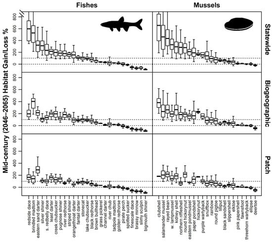 The amount of suitable habitat projected under climate change relative to current predictions varied greatly among species and across statewide, biogeographic, and patch spatial extents (Figure 4). In general, mussels were projected to experience greater habitat gains and fishes were projected to experience greater habitat losses across all spatial extents examined. Fishes with projected increases in suitable habitat by mid-century had an average net gain of 194% when future habitat suitability model predictions were applied at a statewide extent. Average habitat gains for fishes dropped to 126% when future habitat suitability predictions were restricted to the biogeographic extent. When habitat suitability predictions were further restricted to the patch extent, average net gains in habitat were less than half the gains predicted for the statewide extent at 96%, but still represented, on average, nearly a doubling of the amount of suitable habitat currently available. A similar pattern was observed for mussel species projected to experience increases in suitable habitat by mid-century. Average net gains were 296% when habitat suitability models were applied to the statewide extent, dropped to 180% when model predictions were restricted to the biogeographic extent, and were lowest at 126% when model predictions were restricted to the patch extent. In contrast, results for species expected to experience habitat losses under climate change did not differ greatly when habitat suitability predictions were applied at different spatial extents. Average net habitat losses for fishes were 49%, 52%, and 52% and average net habitat losses for mussel species were 10%, 24%, and 23% for statewide, biogeographic, and patch spatial extents.