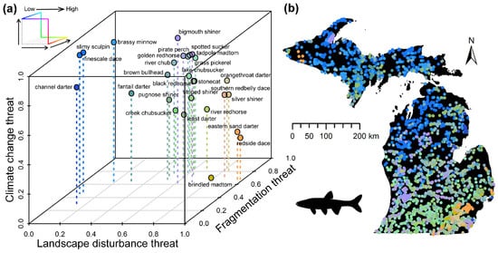 Consideration of multiple threat types has been increasingly identified as an important component in the conservation of fluvial organisms and their habitats [62,63,64,65]. In the current study, evaluating one threat type in the absence of evaluating other threats would have yielded an incomplete picture of the threats imperiled species are facing within the study region. For instance, contemporary conditions including human landscape disturbance and habitat fragmentation suggest that finescale dace, brassy minnow, and slimy sculpin have least-disturbed and relatively unfragmented stream habitats compared to other imperiled stream fishes, however climate change projections indicate that they are the most vulnerable stream fishes to future habitat losses. Conversely, other species such as redside dace, silver shiner (Notropis photogenis), and brindled madtom (Noturus miurus) are anticipated to have large gains in habitats according to climate change projections, yet these species have the highest levels of human landscape disturbance among habitats with projected future habitats being similarly degraded. These examples show that by including multiple threats, both dominant threats and unique combinations of threats, which often vary by taxa and species, can be identified. By combining multiple threats in the current study, interpretation of climate change projections could be achieved in the context of stream fragmentation and landscape disturbance. This can lead to the prioritization of habitats with low to moderate landscape disturbances that are retained in the future.