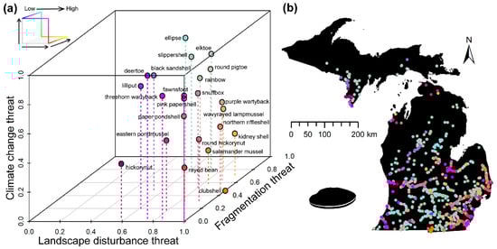 Threats to mussel species represented by three threat dimensions: climate change, human landscape disturbance, and fragmentation (a) and spatial distribution of known mussel occurrences (b) colored by composite threat through conversion of threat indices to the Red-Green-Blue (RGB) color system. Note, the study region is displayed in black in (b).