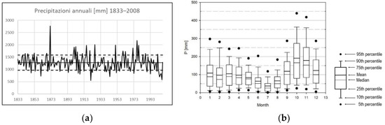 The site is characterized by a strong seasonality of precipitation events, with the maximum values of monthly precipitation occurring in the fall season, while a minimum is reached in summer. In the right-hand panel of Figure 1, the observed variability of monthly precipitation is reported in the form of boxes and whiskers. The amplitude of the boxes and the distance between whiskers and dots reflect the dispersion of the data, and the distance between the mean and median values (if any) is indicative of a non-symmetric distribution.