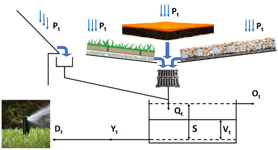 The behavioural model is based on a conceptual scheme implying the collection of rainwater from the drainage of ground surfaces and/or some building roofs. The model performs, at a daily scale, the balance of the incoming and outgoing volumes associated with the collected rainwater flows and the water supply. The daily water demand is calculated to only meet the landscape irrigation water needs. In Figure 2, a schematic of the RWH system is illustrated, and the variables used to describe the various components of the behavioural model are indicated, where t is the simulation interval, Pt (L) is the precipitation amount, Qt (L3) is the volumetric rainwater inflow to the storage tank, S (L3) is the storage capacity of the system (or tank volume), Vt (L3) is the actual rainwater volume stored in the system, Yt (L3) is the released volume, Ot (L3) is the overflow volume, and Dt (L3) is the water demand. The rainwater inflow to the storage tank Qt (L3) is evaluated based on the flow that is collected at each computational step t and conveyed to the storage tank using the rational formula: