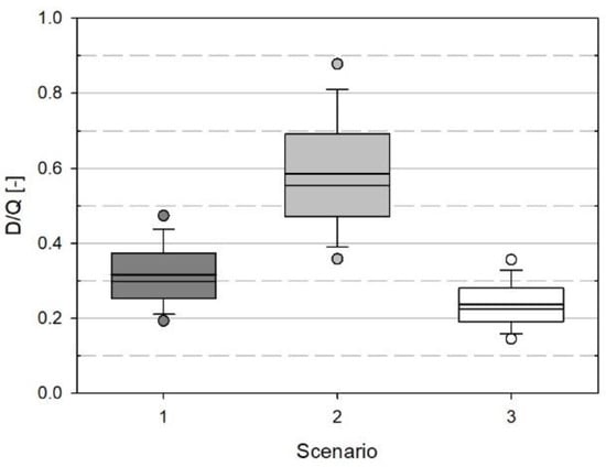 Box-and-whisker plots of the variability of the annual demand fraction (D/Q) during the simulation period for the three investigated scenarios. The box-and-whisker description is the same as in Figure 1.