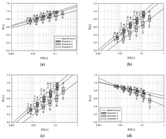 Box-and-whisker plots of the variability of the annual temporal reliability indices (R and Re in panels (a) and (b), respectively) and volumetric reliability indices (ET and OT in panels (c) and (d), respectively) as a function of the storage fraction (S/Q) in the three investigated scenarios. The box-and-whiskers description is the same as that in Figure 1. Continuous lines represent the logarithmic regression function calculated from the mean values of the investigated indices.