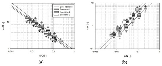Box-and-whisker plots of the annual variability of the usage volume per unit of tank capacity (U = YT/S, panel (a)) and normalized detention time (τ/τ*, panel (b)) as a function of the storage fraction (S/Q) in the three investigated scenarios. The box-and-whisker description is the same as that in Figure 1. Continuous lines represent the power law regression function calculated from the annual mean values.