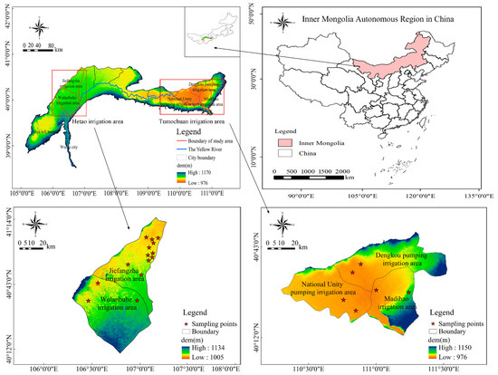 The Yellow River irrigation area in Inner Mongolia and distribution of sampling points.