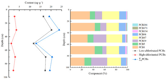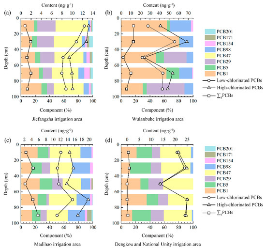 The content of PCBs in different irrigation plots was dominated by low-chlorinated PCBs, and the highest concentrations of low- and high-chlorinated PCBs were observed in the Wulanbuhe irrigation area soil profile. The distribution characteristics of low-chlorinated biphenyls in different irrigation areas were basically consistent with Σ8PCBs; high-chlorinated PCBs were significantly different, and the mean concentrations of high-chlorinated PCBs from high to low were Wulanbuhe > Madihao > Jiefangzha > Dengkou and National Unity. The high-chlorinated PCBs in the Dengkou and National Unity pumping irrigation areas were lower than 1 ng·g−1, and were not detected in the 40–80 cm soil layers.