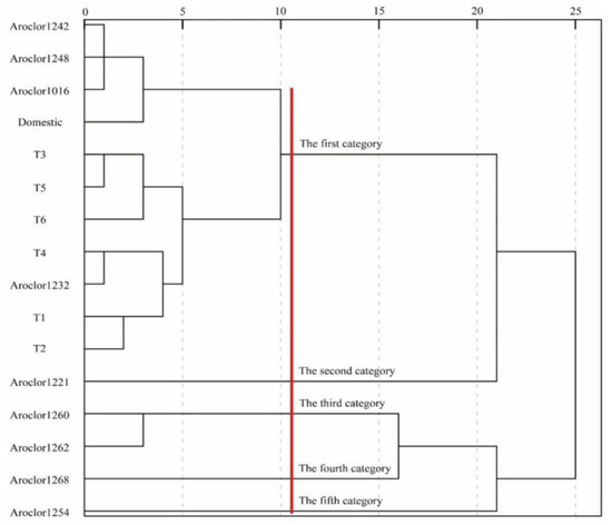 The clustering results of soil samples in the Tumochuan irrigation area, domestic transformer oil, and Aroclor series PCB products are shown in Figure 5, which can also be divided into five categories. The first category included six samples of shallow soil in the Hetao irrigation area, four types of Aroclor industrial products (Aroclor1242, Aroclor1248, Aroclor1016, and Aroclor1232), and domestic transformer oil. Therefore, the PCBs of the above six sample points may come from these four types of Aroclor industrial products and domestic transformer oils. The second category was Aroclor1221, the third included Aroclor1260 and a Aroclor1262, the fourth was Aroclor1268, and the fifth was Aroclor1254. In conclusion, PCBs in shallow soil of Tumochuan irrigation area originated from Aroclor1242, Aroclor1248, Aroclor1016, and Aroclor1232 industrial products and domestic transformer oil.