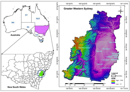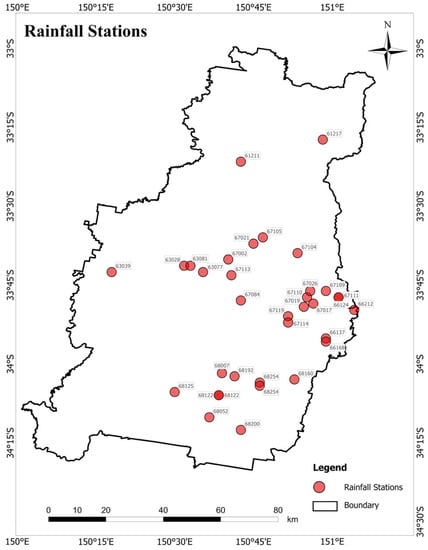 Great Western Sydney (GWS) is situated in the western region of Australia’s Sydney metropolitan area, as shown in Figure 1. From Windsor in the north to Campbelltown in the south, and from Parramatta in the east to Penrith and the Blue Mountains in the west, it encompasses 13 local government districts. The selected area, which has one of the fastest increasing populations, is anticipated to have 2.6 million residents living there. GWS spans an area of around 5800 km2. It is Australia’s third biggest economy, behind Sydney and Melbourne. Western Sydney experiences a humid subtropical climate. The first few months of the year, February through April, are wetter, and the months of July through December are drier. Figure 2 shows the locations of the selected rainfall stations, while Table 1 provides the list of selected rainfall stations, coordinates (latitude and longitude), duration and average annual rainfall (AAR) for the selected stations. The daily rainfall data for the historical period at the selected locations were obtained from the Australian Bureau of Meteorology (BOM). The selected sites have mean annual rainfall of 862 mm/year, which ranges from 638 to 1408 mm/year. More details of the used data are provided in Table 2. The study area map of the Greater Sydney region is shown in Figure 1.