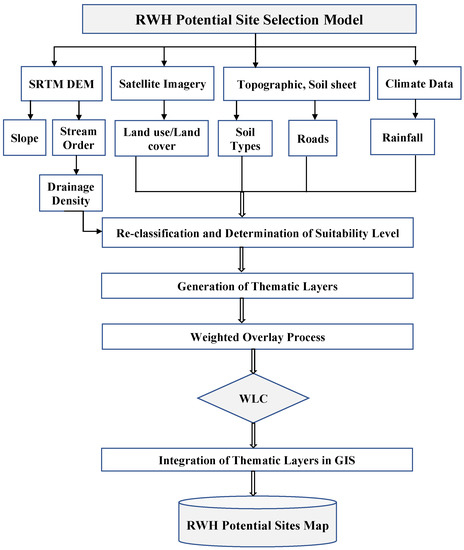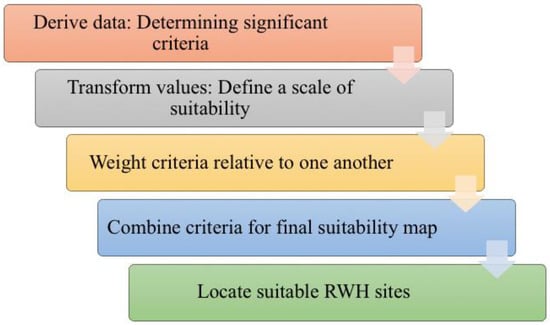 This study adopted a GIS based muti-criteria decision analysis (MCDA) modelling approach to standardise various data layers. For locating an ideal RWH site for irrigation, the thematic layers must have certain feature such as (l) kind of soil having sufficient clay to retain water and limit seepage; (2) a flat terrain that allows for economic construction; and (3) adequate amount of runoff that can be stored on depressed land or in rainwater tanks [34]. The weighted linear combination (WLC) was selected to rank and prioritize the thematic layers dataset. The thematic layers including land use/land cover, soil type, slope, stream order, drainage density, and the runoff layers were prepared, classified, and integrated into GIS environment. Furthermore, a suitability rating was also allocated to each layer in this analysis, and the layers were then combined using the ArcGIS program. Afterwards, the various layers that had been weighted were combined to create the final suitability map. Figure 3 shows the main steps used in site selection of RWH structures.