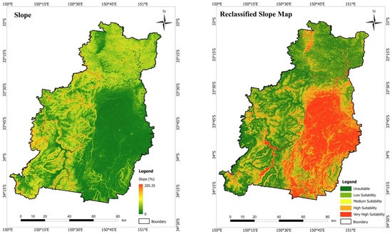 Study area’s slope and reclassified slope map slope (left); reclassified slope (right).