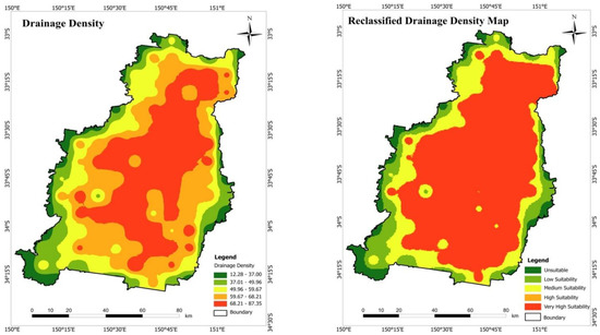 Figure 10 depicts the drainage density and reclassification map of the study area, and Table 4 displays the drainage density suitability class table. RWH is more likely to occur in areas with higher drainage densities. According to the map in Figure 10, the study area’s 80% has the highest concentration of stream densities.