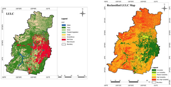 Land use/land cover and reclassified suitability map LULC (left); reclassified LULC (right).