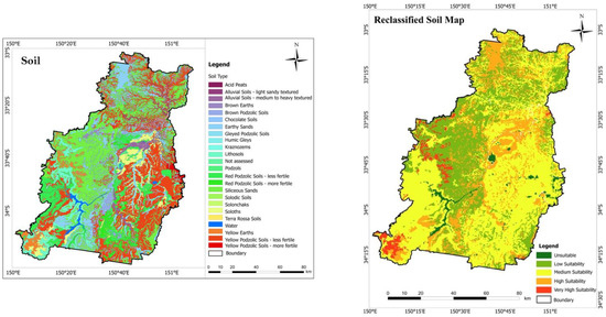 Soil types and reclassified suitability map soil (left); reclassified soil (right).