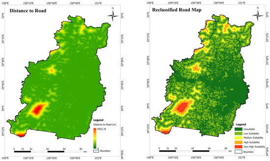 Euclidean distance function, as illustrated in Figure 13, is used to calculate the distance to roadways, with values ranging from 0 to 9452 m. In Figure 13, a reclassified map with suitability classifications is also displayed.