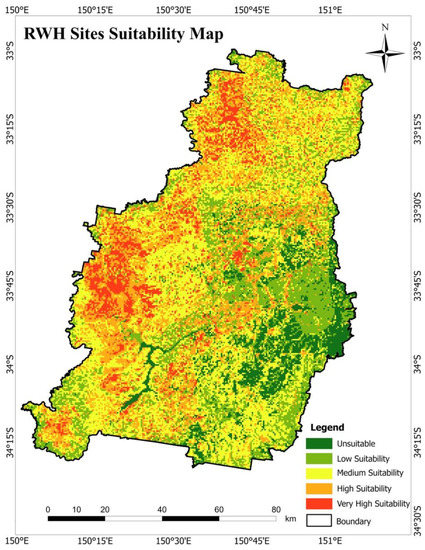 where: S is the suitable site, RIWi is the relative importance weight of the input layer i (rainfall, slope, stream order, drainage density, land use/land cover and soil type) for RWH system and is the degree of appropriateness/suitability of the input layer. The higher the of a given cell is, the better suited it is for RWH system. Equation (2) produced a dimensionless value called S. Five categories were used to grade the S: unsuitability, low suitability, medium suitability, high suitability, and very high suitability. This approach was used in several earlier studies [6,13,28,46,48]. The primary thresholds used to determine the site appropriateness levels for the RWH systems are the final weights of every standard, preferred values for the criterion classes, and buffering zones. The final RWH suitability map is created by combining this layer with the WLC method’s output layer.