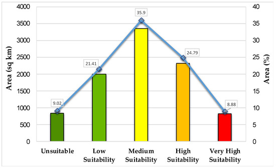The selected areas supporting RWH structure were divided in sub-areas based upon their suitability. In order to do this, the suitability classes were categorized into areas based on ranking that were, very high suitability, high suitability, medium suitability, low suitability and unsuitable regions, as illustrated in Figure 14. The suitability rankings for these locations range from 5 to 1, with 5 denoting the most appropriate sites and 1 denoting unsuitable/restricted sites. According to Figure 15, the study area was most heavily represented by the moderately appropriate regions, which made up 36% of the overall area. The regions with a 9% regional coverage were at the lowest scale and were entirely disregarded as unsuitable. About 8% and 25%, respectively, were covered in the high and very high appropriate zones. The majority of the regions were given the greatest attention for identifying the RWH structures, as they were best-suited sites for these areas in terms of rainfall, slope, stream order, drainage density, soil, land use/cover and distance to roads. Figure 14 shows the final RWH sites suitablility map of the study area while Figure 15 shows the distribution of areas covered by the RWH suitability classes.