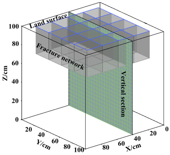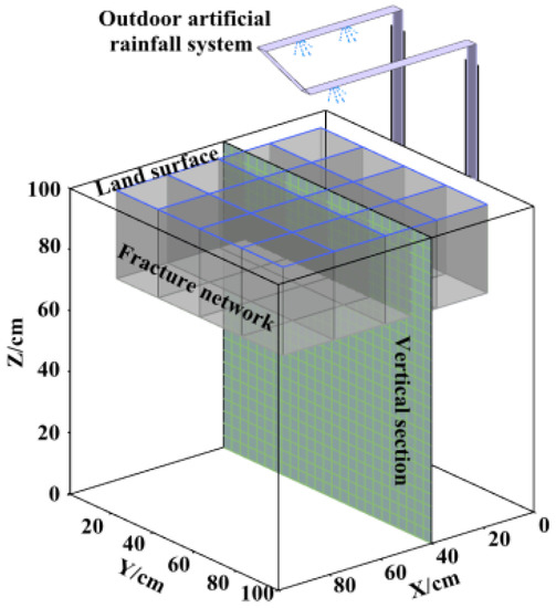 The experiment was divided into four groups, S2-1 to S2-4, according to the different rainfall intensities and rainfall durations, as shown in Figure 2. Each experiment area was 100 cm long and 100 cm wide. An electric drill was used to punch the steel plate to extrude it into the soil at a thickness of 0.5 cm, forming a rectangular network of artificial soil fissures. The depth of each crack was 30 cm, and the length was 90 cm, a total of ten, as shown above. Before the experiment, the initial water content of the soil was measured by excavating the working profile (parallel to the Z-Y plane) on the side of the experiment area. When the experiment started, potassium iodide reagent (20 g/L) was added to the simulated rainfall source, and the experiment was carried out according to Table 2. Due to the intense evaporation in the research area, to ensure the water balance, after the tracer solution completely penetrated the earth’s surface, we covered the experiment area with a tarpaulin to prevent evaporation. Finally, the vertical profile was excavated layer by layer every 5 cm along the X-axis of the experiment area, and spray starch solution was added to each layer. Sodium hypochlorite was added to the solution to accelerate the complete oxidation of iodide to iodine. The iodine reacted with the starch in a molecular state and permeated into the region where water passes by. As there was iodine, the iodine reacted with starch and turned blue. For regions where water did not pass, the color of the soil did not change. In this way, the flowing region and nonflowing region were confirmed. We then photographed the experiment profile and measured the soil moisture content. Soil samples were collected as described above.