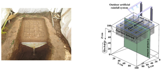 Fractures generated during soil shrinkage in farmland can be used as preferential flow channels, allowing part of the soil water to bypass the soil matrix and rapidly infiltrate along the fissures, which is widely recognized as a common phenomenon in hydrology [8,9,10]. Fractures can serve as a preferential flow path during irrigation or rainfall, accelerating water infiltration, reducing the use efficiency of water and fertilizer, and increasing the risk of groundwater pollution [11,12]. At the same time, they are one of the inducing factors of geological disasters, such as debris flow, landslides, collapses, and soil erosion. When rainwater enters the fractured soil from the slope surface, it flows in the fractured network and infiltrates the soil matrix. Compared with nonfractured soil, the presence of fractures increases the infiltration capacity and the lateral flow of soil water, ultimately affecting the slope’s hydrology [13,14,15]. The occurrence of dry-shrinkage cracking not only affects the water movement in the soil but also affects the surface runoff dynamic parameters due to factors such as the slope flow rate, the single-width flow rate, and Reynolds number reduction [16].