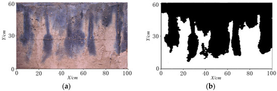 The experiments were divided into 7 treatment groups according to different amounts of infiltration water, S1-1 to S1-7, as per Table 2. Each experiment area was 100 cm long and 100 cm wide, as shown in Figure 1. Before the experiment, the experiment area was fully saturated. According to the soil density of the experiment area, the fractures appearing during the evaporation and cracking processes of the S1-3 and S1-6 groups were landfilled. Three days later, a dye tracer experiment was carried out. The dye was selected to be a bright blue solution of 4 g/L. After the solution had completely penetrated the surface, the experiment area was covered with a plastic plate to avoid evaporation. After 14 h of infiltration, profiles were excavated layer by layer in the experiment area, and vertical profiles were excavated layer by layer at intervals of 5 cm in the axial direction and photographed for recording. After taking photographs, soil samples were collected from the stained and unstained regions to measure soil water content distributions. More than fifty soil samples were collected in the stained and unstained regions at depths of 0, 0.10, 0.20, 0.30, 0.40, 0.50, 0.60, 0.70, and 0.80 m.