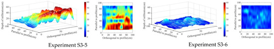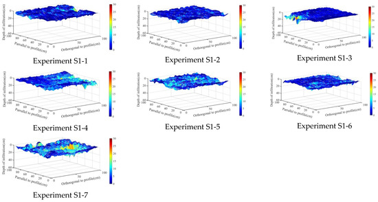 In experiment S1, when the infiltration volume was 10 L, the average infiltration depths of S1-1, S1-2, and S1-3 were 2.55 cm, 2.65 cm, and 2.44 cm, respectively, and the variances were 6.5, 7.7, and 4.2, respectively. When the infiltration volume was 20 L, the average infiltration depths of S1-4, S1-5, and S1-6 were 5.33 cm, 5.65 cm, and 3.94 cm, respectively, and the variances were 12.2, 12.5, and 7.5, respectively. When the infiltration volume was 30 L, the average infiltration depth of S1-7 was 7.36 cm, and the variance was 20.0. The infiltration depth of 30 L increased by 4.71 cm compared with that of the 10 L infiltration. As can be seen from Figure 5, when the infiltration water increased, the average infiltration depth also increased, and the infiltration uniformity became worse. With the same infiltration water, the nonfractured experiment using a landfill treatment was smaller in terms of the average infiltration depth compared with the fractured experiment without a landfill treatment, and the infiltration was uniform.