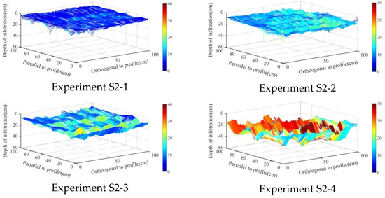 In experiment S2, the average infiltration depths of S2-1, S2-2, S2-3, and S2-4 were 6.13 cm, 12.27 cm, 12.97 cm, and 26.14 cm, respectively, and the variances were 4.0, 5.5, 15.0, and 49.6 respectively. As can be seen from Figure 6, when the rainfall intensity was 20 mm/h, and the rainfall duration was 20 min, the average infiltration depth was shallow, the water infiltration was uniform, and the preferential flow began to develop and form. However, the matrix flow area was larger, and the preferential flow only developed locally. When the rainfall intensity was 50 mm/h, and the rainfall duration was 50 min, the partial infiltration depth exceeded the depth of the fractures and the water infiltration was very uneven. In this case, there were more preferential flow channels and better preferential flow developments. The increase in rainfall intensity and rainfall duration increased the average infiltration depth and the infiltration uniformity.