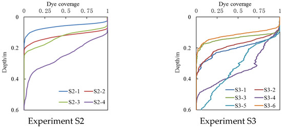 Establishing the dyeing area ratio is an intuitive and quantitative way of describing the trajectory of preferential flow in a vertical profile. By drawing different layers in the vertical direction, the three-dimensional spatial distribution of the preferential flow can be obtained [20]. In experiment S2, the average dyeing areas of the S2-1, S2-2, S2-3, and S2-4 treatments were 10.2%, 20.5%, 21.6%, and 41.7%, respectively. As can be seen from Figure 8, the average dyeing area ratio with different treatments decreased with the increase in the infiltration depth, indicating the infiltration process was not balanced and that there was a preferential flow phenomenon. The average dyeing area increased with the increase in rainfall intensity and rainfall duration. When the rainfall intensity was 20 mm/h, the average dyeing area decreased slowly with the increase in infiltration depth, and then, it decreased to zero rapidly. At this point, only a small part of the preferential flow was developed, and the soil water infiltration was mainly dominated by matrix flow. When the rainfall intensity was 50 mm/h, and the rainfall duration was 50 min, the curve of the average dyeing area changed slowly with the infiltration depth. At this point, the preferential flow was well developed, there was more preferential flow path, and the preferential flow was larger.
