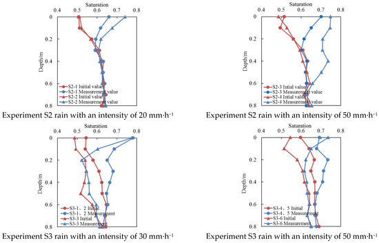 In experiment S2, as seen in Figure 9, when rainfall was 20 mm/L, the saturation of the interval also increased from 0 to 0.3 Zmax (Zmax is the maximum infiltration depth) with the increase in duration. At 0.3 Zmax, the saturation curve after rainfall gradually intersected with the initial saturation curve. When the rainfall duration increased, the saturation after rainfall increased, but the infiltration depth did not increase obviously, and the soil water infiltration was mainly based on the matrix flow. When the rainfall intensity was 50 mm/h, and the rainfall duration was 50 min, the saturation curve after rainfall intersected the initial saturation curve at 0.6 Zmax. At this time, there was a deep soil water infiltration depth with more infiltration, and preferential flow was better developed.