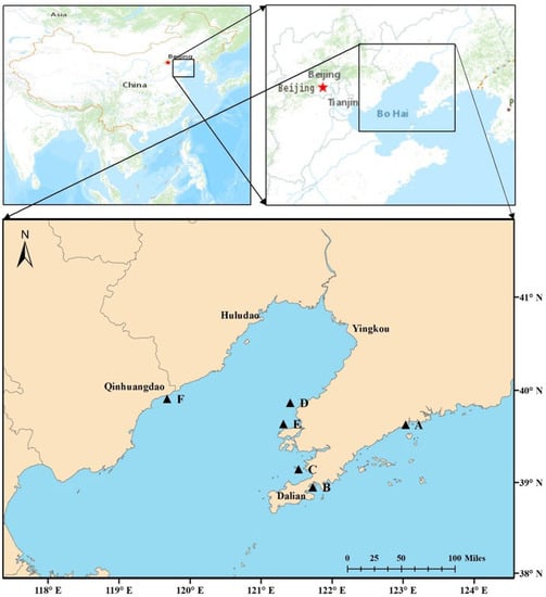 Locations of sampling sites for S. scutata and sediments (A: Zhuanghe; B: Dalian Bay; C: Jinzhou Bay; D: Hongyanhe; E: Changxingdao; F: Qinhuangdao).