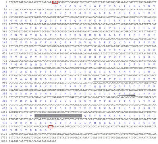 Nucleotide and deduced amino acid sequence of S. scutata CYP4. Note: 5′ untranslated regions are shown as 1–27, 3′ untranslated regions are shown as 1556–1829, the open reading frame is shown as 28–1555, and the deduced amino acid sequence is shown under the nucleotide. The initial codon and stop codon were underlined with red box. The terminator is shown as *. I-helix motifs are indicated with solid lines. K-helix motifs are shown with double-solid line. Heme-binding motifs are shown in a gray-filled box.