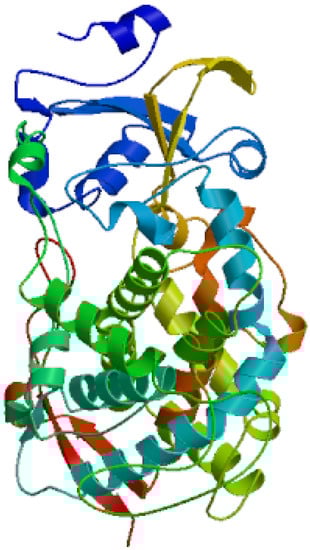The secondary structure of the protein was composed of 43.42% α-helix, 9.04% extended strand, and 47.54% random coil. In the deduced amino acid sequence of CYP4 cDNA, the 309–321 amino acid sequence exhibited a hydrophobic helix I region, the 374–377 amino acid sequences contained the ExxR region of the K-helix characteristic motif, and the 447–456 amino acid sequences conformed to the conserved common sequence heme binding region of P450. The heme binding region (FxxGxxxxCxG), hydrophobic helix I region (EVDTFMFEGHDTT), and K helix region (ExxR) are ubiquitous characteristic sequences in the P450 family. The variation of some non-functional amino acid residues in the conserved region is normal and does not affect the identification of the conserved region. The tertiary structure of CYP4 protein is shown in Figure 3.